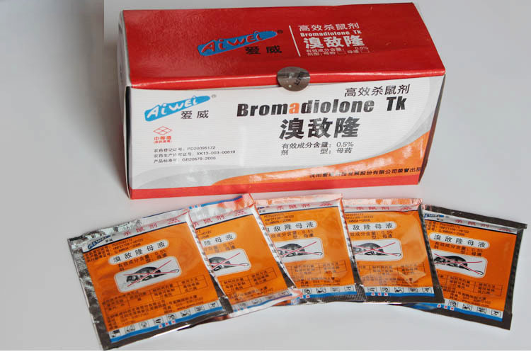 取0.5% 溴敵隆母粉1份,加6~8份水混勻后,與99份(稻谷、大米、玉米、小麥等)混合撐均勻、晾干后使用。